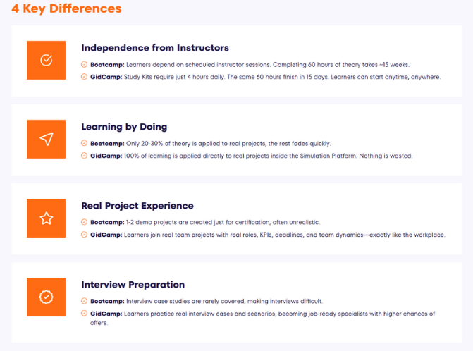 İş axtaranlar, Bacarıqlarını artırmaq istəyən gələcək mütəxəssislər və peşəkarlar GidCamp-ə iştirakçı kimi qoşula bilərlər. Seçdikləri sahədə həm nəzəri, həm də praktiki biliklər əldə edir, güclü bir portfolio yaradır və müsahibələrdən uğurla keçmək və iş təkliflərini təmin etmək üçün tam hazır olurlar — bu da GidCamp məzunlarının karyera yolunda uğur şansını əhəmiyyətli dərəcədə artırır.